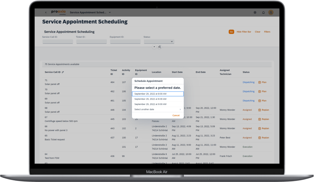 Customers find relevant information on all completed and upcoming on-site service interventions. They have the possibility to schedule and replan appointments with their preferred field technicians available at the most convenient time. The module provides interactive planning, which is directly reflected in your planning board for your dispatchers.