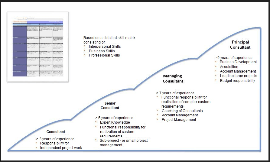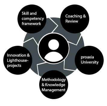 At proaxia, career levels are clearly defined based on a fully developed skill matrix.  Areas of development are highlighted and actions for further development are defined in biannual meetings between employee and coach. Career level classifications are continually reviewed and adjusted.